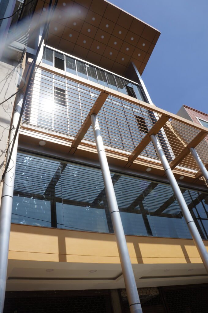 The building incorporates basement parking and accommodates retail shops, office spaces, and a gymnasium. A cantilevered canopy, along with a sloping south-facing façade, is designed to mitigate harsh summer sunlight, enhancing interior comfort while contributing to the building’s dynamic architectural expression