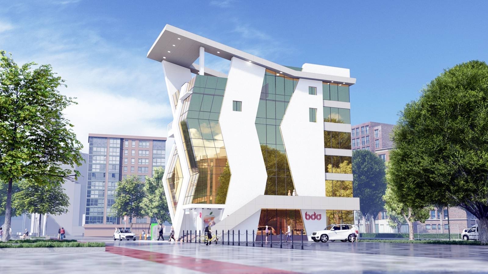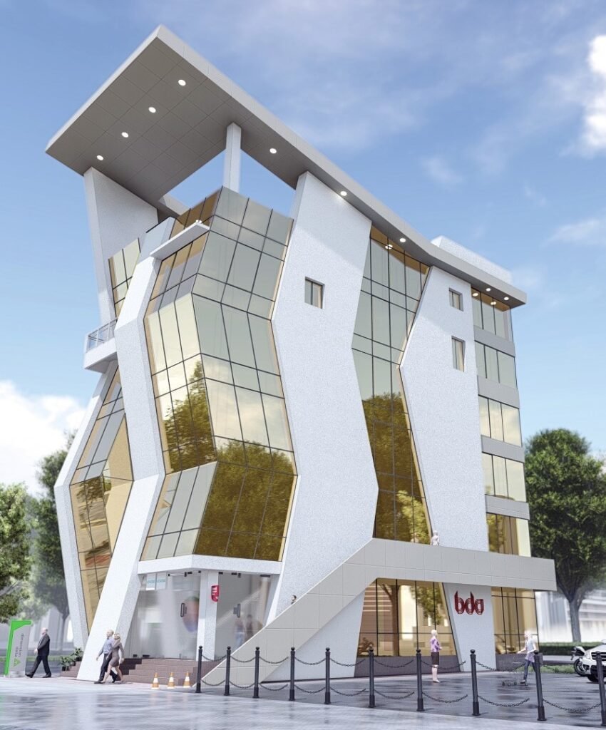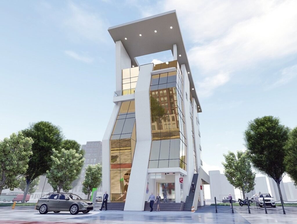 Designed as a mixed-use commercial development, the building accommodates retail functions at the ground level and office spaces on the upper floors, culminating in a penthouse at the top. An externally expressed staircase serves as a prominent circulation feature, activating the façade and strengthening the building’s visual character.