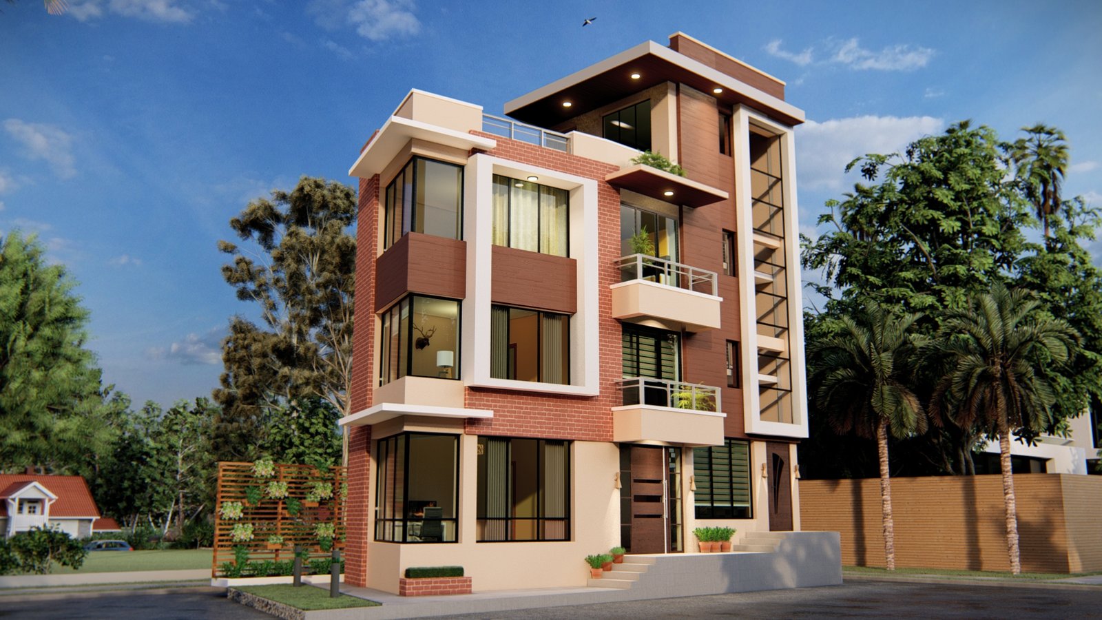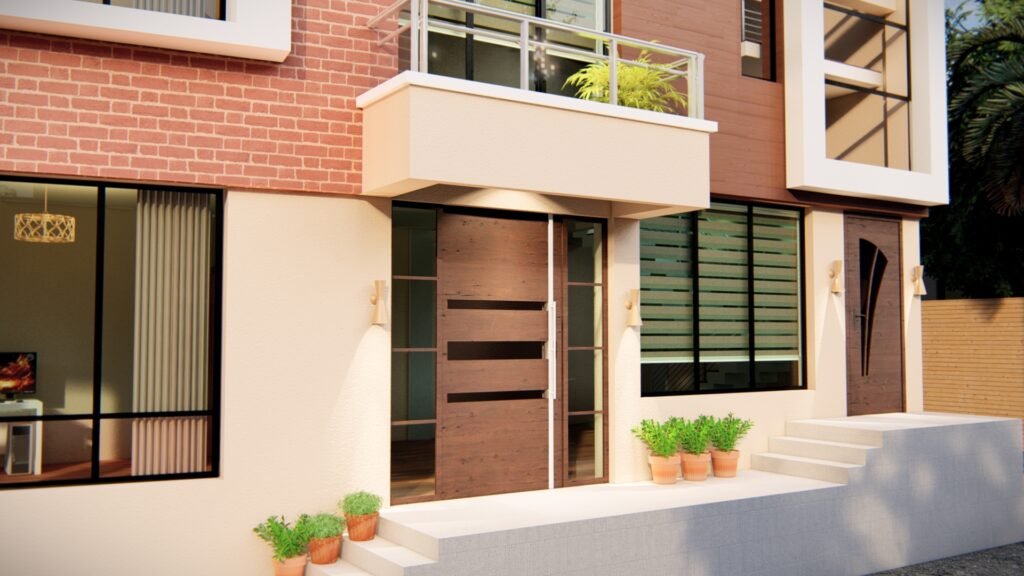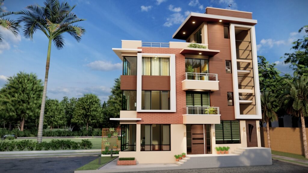 Designed on a 3 aana plot, facing east, the house incorporates a rentable residential unit on the ground floor, while the upper floors are planned for single-family living.